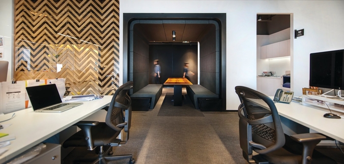 開(kāi)放式工作區(qū)和建設(shè)的核心–本身的包裹封閉的會(huì)議空間是一個(gè)循環(huán)的–走廊4m幅寬和對(duì)比地板的顏色給它運(yùn)行軌道的感覺(jué)之間的象征。