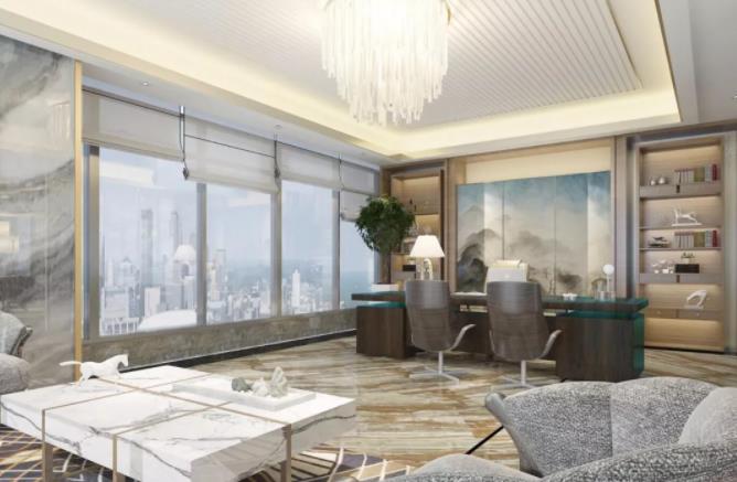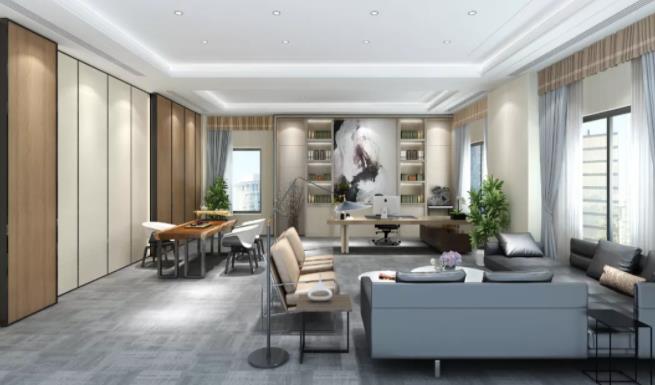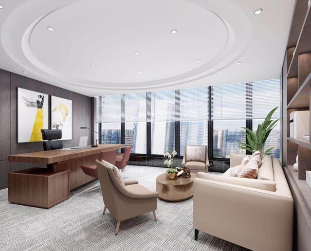 2、現(xiàn)代輕奢風(fēng)辦公樓接待大廳裝修:整個(gè)辦公空間分為頂、墻、地三個(gè)部分,頂面以圓形和橢圓形疊級(jí)吊頂造型裝飾,輕松、休閑的燈光營造氛圍,在接待客人談生意時(shí),裝修也能體現(xiàn)一家老板的品味與性格,還有該公司的實(shí)力,公共區(qū)域墻面采用高檔木飾面板裝飾,地面則是地毯滿鋪。總經(jīng)理辦公室裝修設(shè)計(jì)中重要的是超大的落地窗,總經(jīng)理工作上的壓力往往是常人難以感同身受的,站在三十多樓的高樓里,可以一覽城市風(fēng)光,居高臨下俯視這座城市,眺望遠(yuǎn)方舒緩內(nèi)心的壓抑。