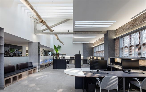 700平米的辦公室裝修設(shè)計(jì):設(shè)計(jì)師們保留了老建筑的原始磚墻,只對吊頂做了百葉格柵的造型設(shè)計(jì),與陽光順向的造型也起到了調(diào)節(jié)空間光線的作用,另外這個(gè)地方我們還吊掛了一棵一分為二的大樹。使用率較高的地方叫做“工作空間”,把較好的南北方向空間給到整個(gè)的工作空間,用較流暢的動(dòng)線來組合這個(gè)部分?!爸獠繀^(qū)域”是我們提出來的一個(gè)概念,這一部分區(qū)域完成的是企業(yè)合作伙伴在工作中的協(xié)同作戰(zhàn)訴求,其應(yīng)該被設(shè)置在有獨(dú)立出入口的中部空間?!靶蜗髤^(qū)域”是企業(yè)面對客戶的精神堡壘,我們會(huì)將其設(shè)置在空間的重點(diǎn)區(qū)位。在辦公室的后邊有一條單獨(dú)的樓梯通往樓下的茶室,也就是在一個(gè)30平米的位置中,又可以重新組成一個(gè)封閉的LOFT空間,滿足我一個(gè)人的創(chuàng)意設(shè)計(jì)和客人接待需要,這個(gè)算是留給自己的一點(diǎn)小私心。