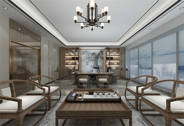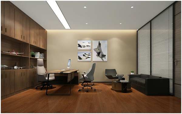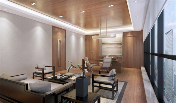 董事長辦公室裝潢設計采用的新中式風格,環(huán)境采用白色和原木色的搭配使用,突出董事長氣質,沉穩(wěn)的同時又不失時尚。