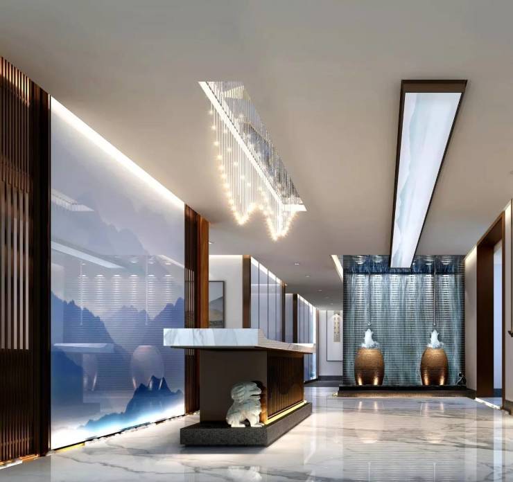 項(xiàng)目采用了禪意文化的手法進(jìn)行設(shè)計(jì),這個(gè)空間即融入了中國(guó)傳統(tǒng)風(fēng)格文化與現(xiàn)代時(shí)尚之中,既有中式的古香古色,又有現(xiàn)代的簡(jiǎn)單自然,東方韻味在現(xiàn)代的背景下若隱若現(xiàn),簡(jiǎn)約的中式造型與現(xiàn)代形式轉(zhuǎn)變?yōu)槭孢m,實(shí)用,為現(xiàn)代辦公設(shè)計(jì)重重的添了一份古典的韻味。禪意辦公室大廳設(shè)計(jì):以現(xiàn)代手法將古典語(yǔ)言融入中式意境,整個(gè)空間散發(fā)出悠然禪文化。頂上一通而過(guò)燈飾造型,如同一條河流,在對(duì)面機(jī)刨石上如瀑布般潺潺流下,兩個(gè)古樸的老缸不停地冒著噴泉。用較少即多的表現(xiàn)方式直接明了的體現(xiàn)了整個(gè)空間文化氛圍,留白的墻,黑色原始頂,現(xiàn)代中式家具與禪意的辦公桌,在現(xiàn)代與傳統(tǒng)的相碰中呈現(xiàn)出了一個(gè)既有文化又有時(shí)尚感的辦公空間。