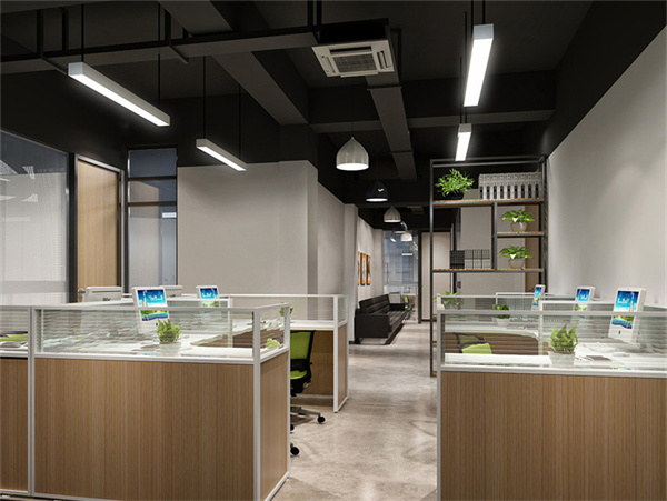 2、該創(chuàng)意園辦公室裝修案例主要以簡約工業(yè)化風格主,設計師運用光線的原理大面積使用玻璃隔斷,天花噴黑 地面油加固漆,使其整個辦公室更加通透、大氣且提高員工的舒適感。