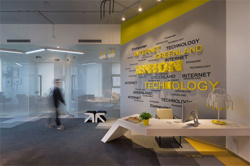 1、600平方互聯(lián)網(wǎng)公司辦公室前臺設計的時候,由于空間自身具有其優(yōu)點——頂相對高,設計師希望可以將這個優(yōu)點聚焦加以放大,設計師將前臺設計成類似弧形的四分之二圓,同時放低其高度,讓墻壁可以完后自己的使命——形象墻,讓前臺空間的屬性可以在此基礎上承擔更多的責任。