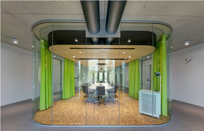 辦公室設(shè)計(jì)效果圖,室內(nèi)設(shè)計(jì)上,建筑師放棄了吊頂,將混凝土天花板直接暴露。室內(nèi)辦公區(qū)采用了大面積的玻璃窗,不僅光線明亮,也與室外發(fā)生更緊密的聯(lián)系。部分空間為了防止過熱以及過多陽光射入,配備了不妨礙用戶欣賞室外風(fēng)景的百葉窗。