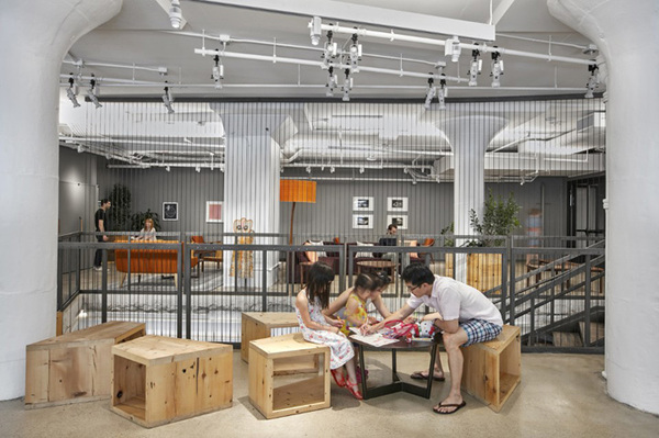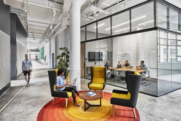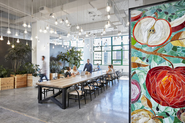 注重復(fù)古和手工藝品的Etsy總部,自然要體現(xiàn)這一獨特元素的設(shè)計和運用,室內(nèi)大量的藝術(shù)品、裝飾品和家具都來自當(dāng)?shù)氐乃囆g(shù)家以及Etsy的網(wǎng)店賣家。入口處手工制作的大型吊燈更是令時尚辦公網(wǎng)的小伙伴們驚艷。在Etsy總部沒有華麗的材料堆砌,只有隨處可見的藝術(shù)品、墻面壁畫、充滿創(chuàng)意的手工藝品、有趣的裝飾品,還有生機(jī)勃勃的綠色植物。