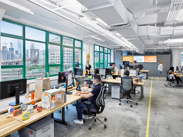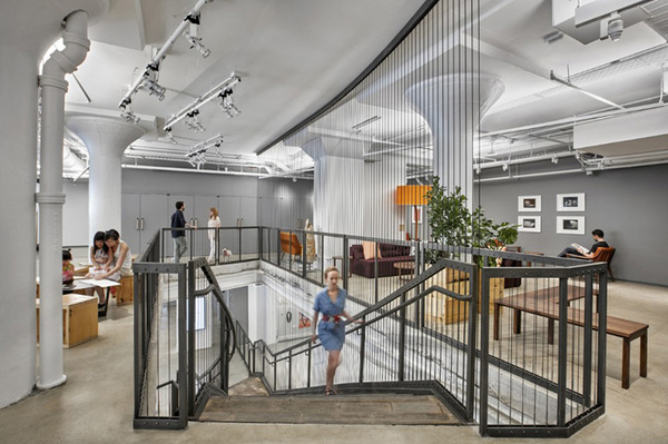Etsy布魯克林總部跨越九個樓層,而每一個樓層都是一個完整均衡的生態(tài)系統(tǒng),幾乎每個樓層都設(shè)有廚房鼓勵大家回收資源。除了花樣繁多的功能空間,如工作區(qū)、協(xié)作區(qū)、會議區(qū)和演示區(qū)等,頂層特地設(shè)計為休閑放松的屋頂露臺,并安裝有太陽能板為室內(nèi)提供能源。