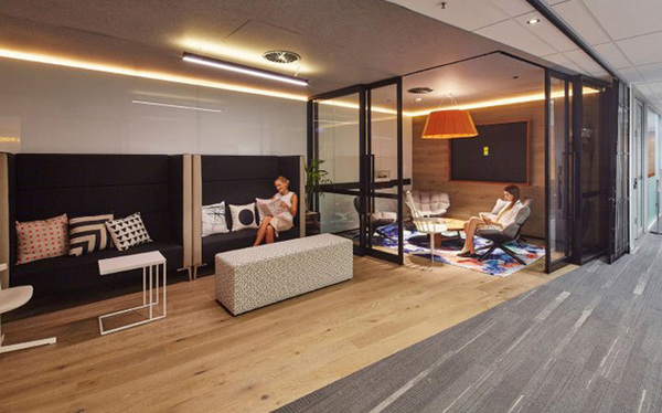 室內(nèi)*精彩的當(dāng)屬一處半圍合的“純白色房間”,白頂、白墻、白地,純凈的白色意在提供一個(gè)清晰的思維空間,讓創(chuàng)意靈感源源流動(dòng)不被干擾。其它特色裝飾包括入口處的星火水晶玻璃墻、精美的天花、頂面定向裝飾的生態(tài)板、雙折門、特色照明燈具、豐富的地面材質(zhì)如木地板、塑膠地板和各色地毯、以及時(shí)尚的黑色儲(chǔ)物柜和漂亮的家具。