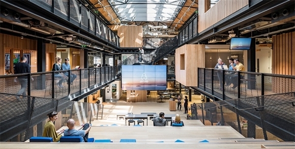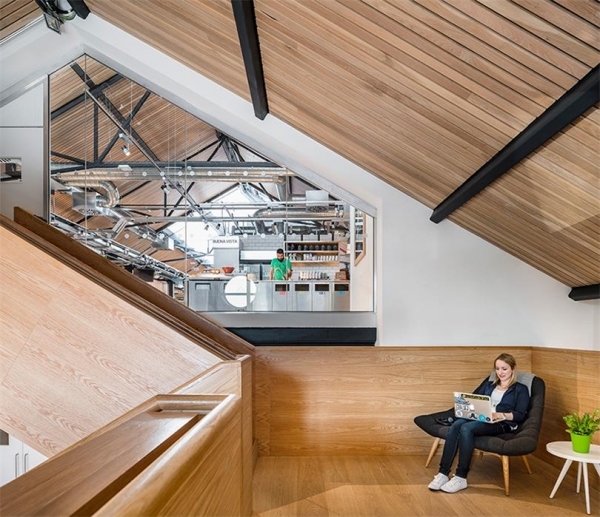 辦公室內(nèi)有29個(gè)鄰里單位,大型公共桌子取代了個(gè)人辦公桌。這些區(qū)域內(nèi)還包括了個(gè)人儲(chǔ)藏空間,一個(gè)或兩個(gè)高凳站立區(qū)域,以及一個(gè)沙發(fā)位。中心樓梯成為辦公室里的聚焦點(diǎn)。樓梯以“廣場(chǎng)”為名,把二層和地面層連接起來(lái),使各樓層空間融為一體。多功能的樓梯能滿足多種用途,從能容納多達(dá)400人的會(huì)議和社區(qū)活動(dòng)空間,到工作環(huán)境里的休息風(fēng)格空間。
