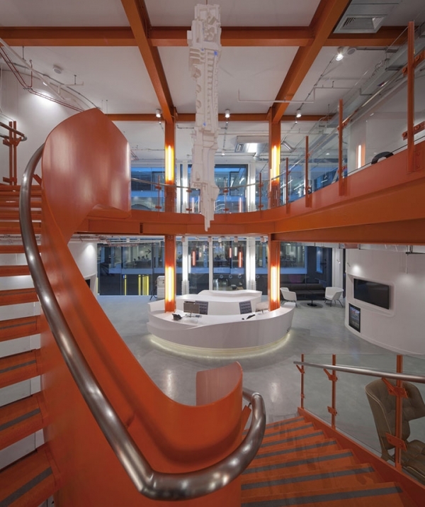 SEI總部辦公室裝修設計給人們帶來獨特的空間體驗,接待大廳一座定制的螺旋鋼樓梯和雕塑般的接待前臺。樓梯中間猶如宇宙飛船般的雕塑,是設計師嘗試用聚苯乙烯這種輕質(zhì)材料打造具有未來感的發(fā)光電塔.