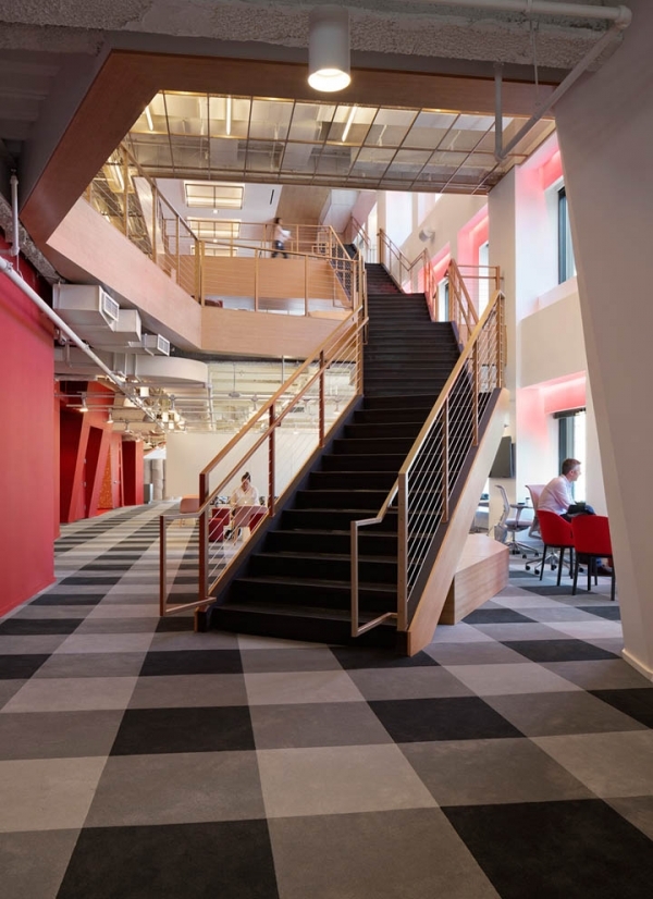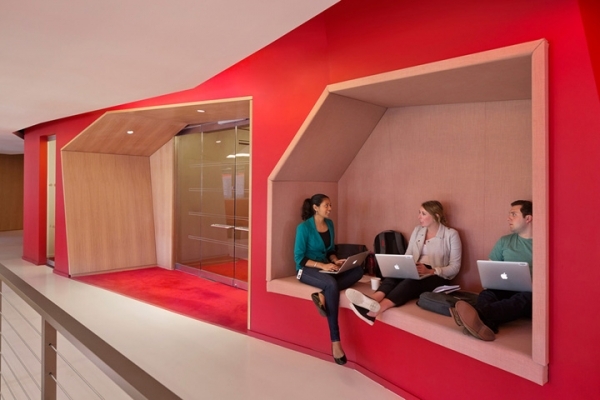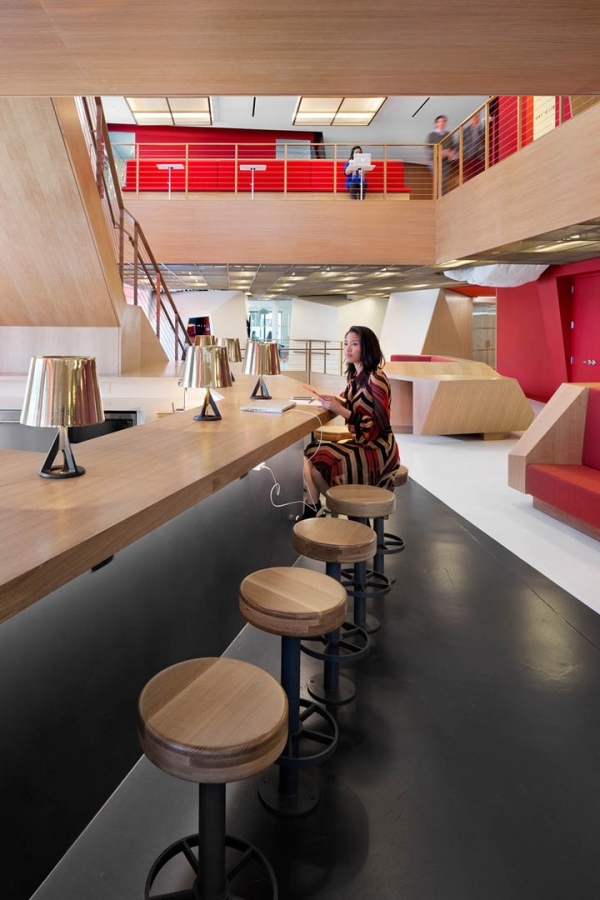 其它特殊功能區(qū)包括開闊的中庭、休閑區(qū)、咖啡吧、酒館式空間等,這樣的設計旨在促進大家更多的聚集和互動交流,增加內(nèi)部的凝聚力,培養(yǎng)文化和知識的共享理念。