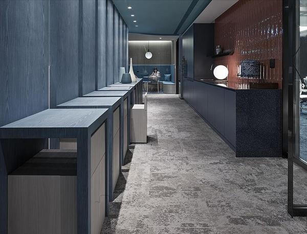 設(shè)計(jì)師萃取了中世紀(jì)文藝復(fù)興的紋理、石材,以及同時(shí)期繪制于宗教畫作的珍貴藍(lán)料元素,以含蓄的約略性質(zhì)展現(xiàn)時(shí)間洗刷的累積過程。整體空間以金色及藍(lán)色為視覺基調(diào),呼應(yīng)財(cái)富與威望、知識與信任的冀求,更于主廊道及茶水間設(shè)置木質(zhì)開放式座椅提供閱讀、討論與休憩,讓室內(nèi)營造出流動性。