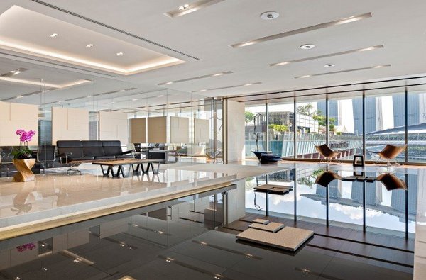 其辦公室裝修設(shè)計(jì)寧?kù)o優(yōu)美、夢(mèng)幻仙境、根植于亞洲的文化特征、精神文化的傳達(dá)、漂浮于水上的玻璃會(huì)議室、視覺(jué)體驗(yàn)。
