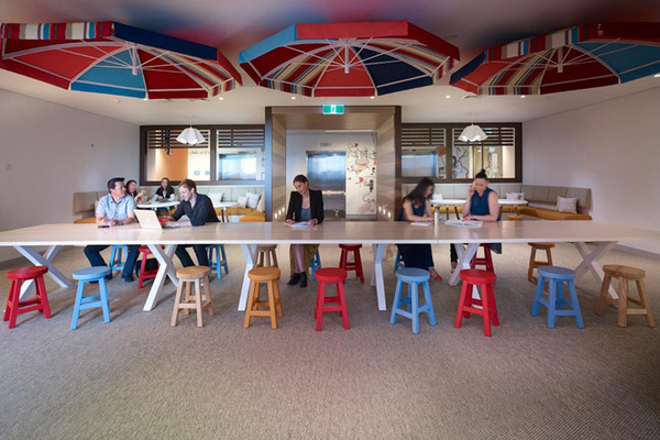 每層都配有舒適的社交空間以契合公司的品牌文化,四個(gè)樓層分別以澳大利亞優(yōu)美的環(huán)境象征來(lái)命名:景觀公園、美麗的后花園、假日海灘、夏日葡萄園。