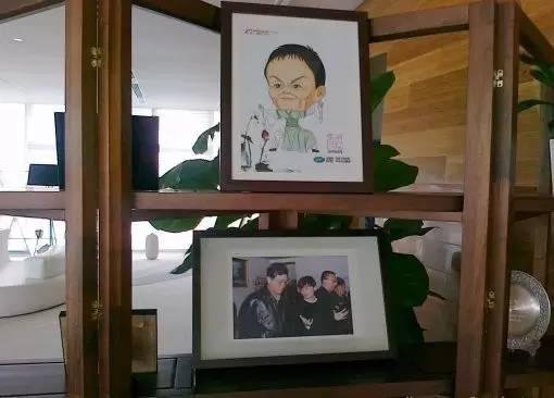書架上的兩副照片,上圖是馬云APEC漫畫像,下圖為考察阿里巴巴。