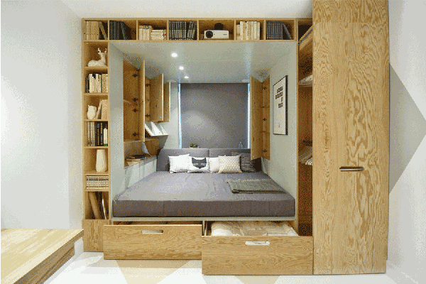 看似簡(jiǎn)潔的天花板其實(shí)是供晚上睡的床。