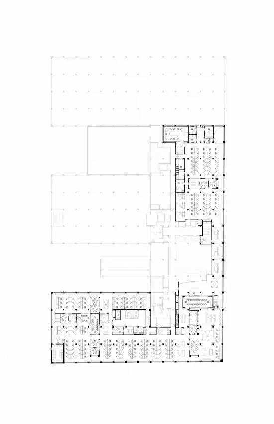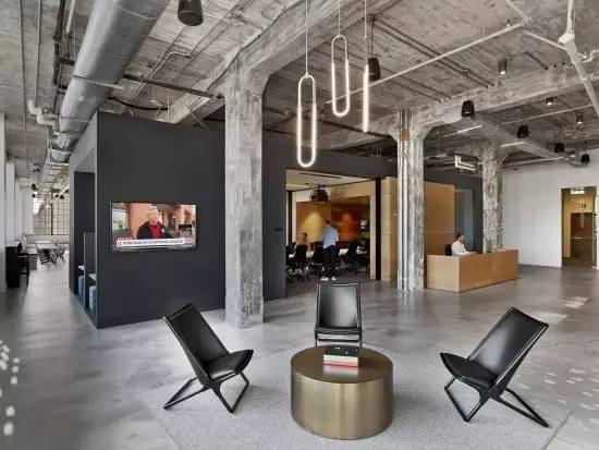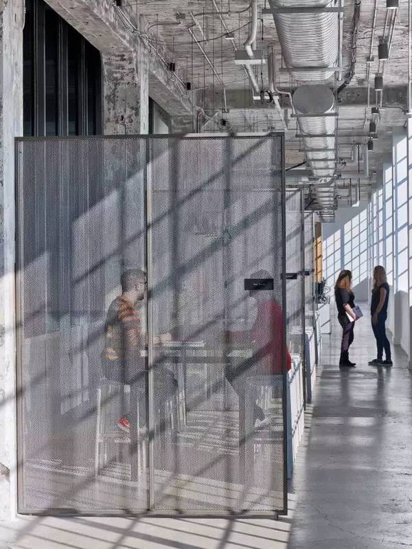結(jié)構(gòu)柱和梁暴露在外,依然覆蓋著近乎一個世紀(jì)的涂料,*小程度的噴砂以防止剝落。表面和家具的靈感來自原始空間;自由形式盒子被包裹在膠合板和深灰色的板巖,椅子顏色從混凝土墻上采樣。設(shè)計師設(shè)計了一個穿孔金屬網(wǎng)系統(tǒng),以允許整個辦公室的開放性和流動性。