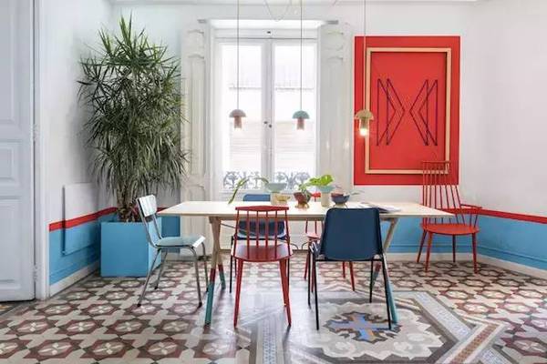 雖然都是白色基調(diào)打底的空間,但每一個卻都個性張揚,比如鋪滿天藍色油漆的墻面搭配以大大小小的黑白裝飾畫,圓形、拱形、直線以及黑白條紋拼貼出來的彩色幾何墻面,紅藍主題的餐廳空間輔以大面積花磚鋪地等等。