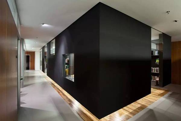這是為律師事務所設計的室內(nèi)空間,空間包含兩層,有著清晰的格局:一層較大,負責公司運行,另一層則較小,負責會議和管理。一旦這兩層被明確地分為功能層和公共活動層,設計想要展示公司理念的任務就落在了第一層上。鑒于此,設計呈現(xiàn)出放射式的空間分布方式,每個會議室都位于邊緣地帶,有室外的景色和自然照明,而被環(huán)繞在中心的是一個巨大的圖書室,它組織通向各個房間的流通系統(tǒng)。