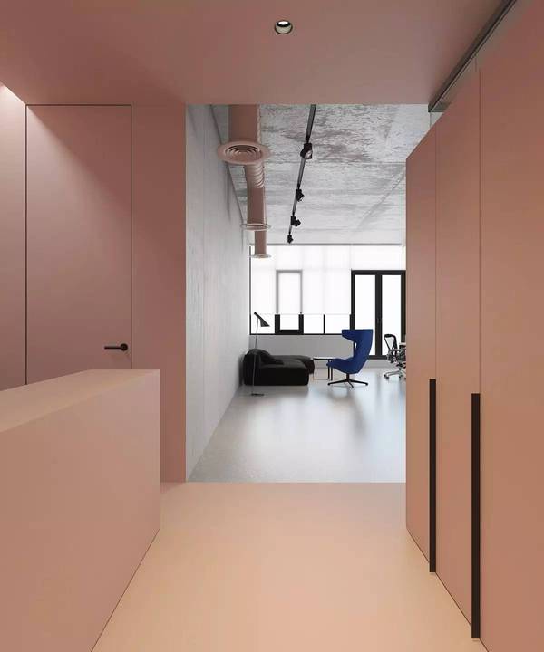 外露的鋼管也被粉刷成粉色,整個(gè)空間采用混凝土鋪陳,從地面延伸至墻面,天花,統(tǒng)一的材質(zhì)讓空間變得簡潔,干凈,中央擺放著一張長條形的巨型辦公桌,通過淡色木質(zhì)面板以及黑色鐵件塑造出輕盈靈巧的視覺感受。休息區(qū)用黑色轉(zhuǎn)角沙發(fā)搭配鮮艷的寶藍(lán)色單人椅,帶來鮮明的對(duì)比。