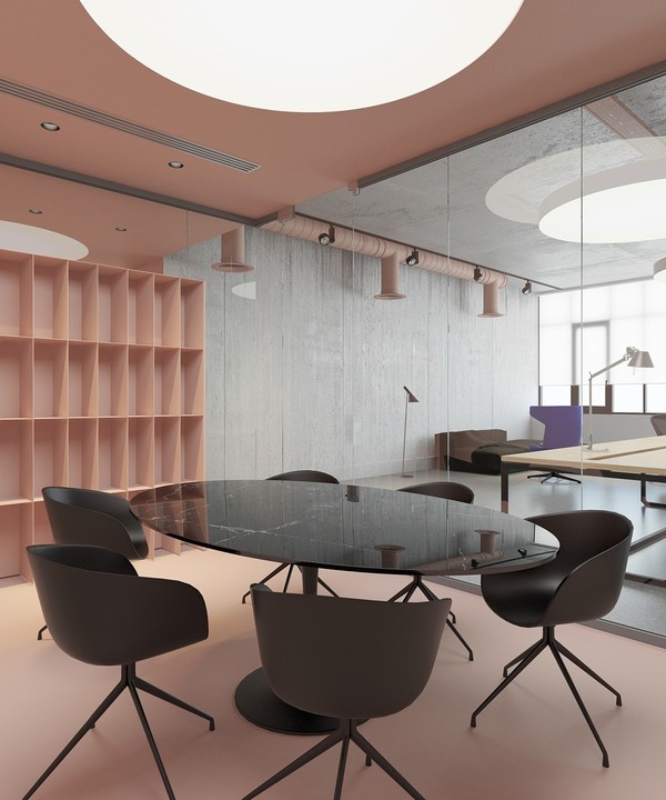 用玻璃隔斷劃分出會(huì)議室,肉粉色的空間搭配質(zhì)感的黑色桌椅,柔美與硬朗相互沖突,形成強(qiáng)烈的視覺感受。