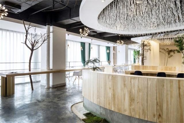 在材料的運(yùn)用上選用的都是一些環(huán)保低碳的天然材料,如樹枝、石竹、枯木、天然原木板,地面則是采用了水泥自流平的方式。