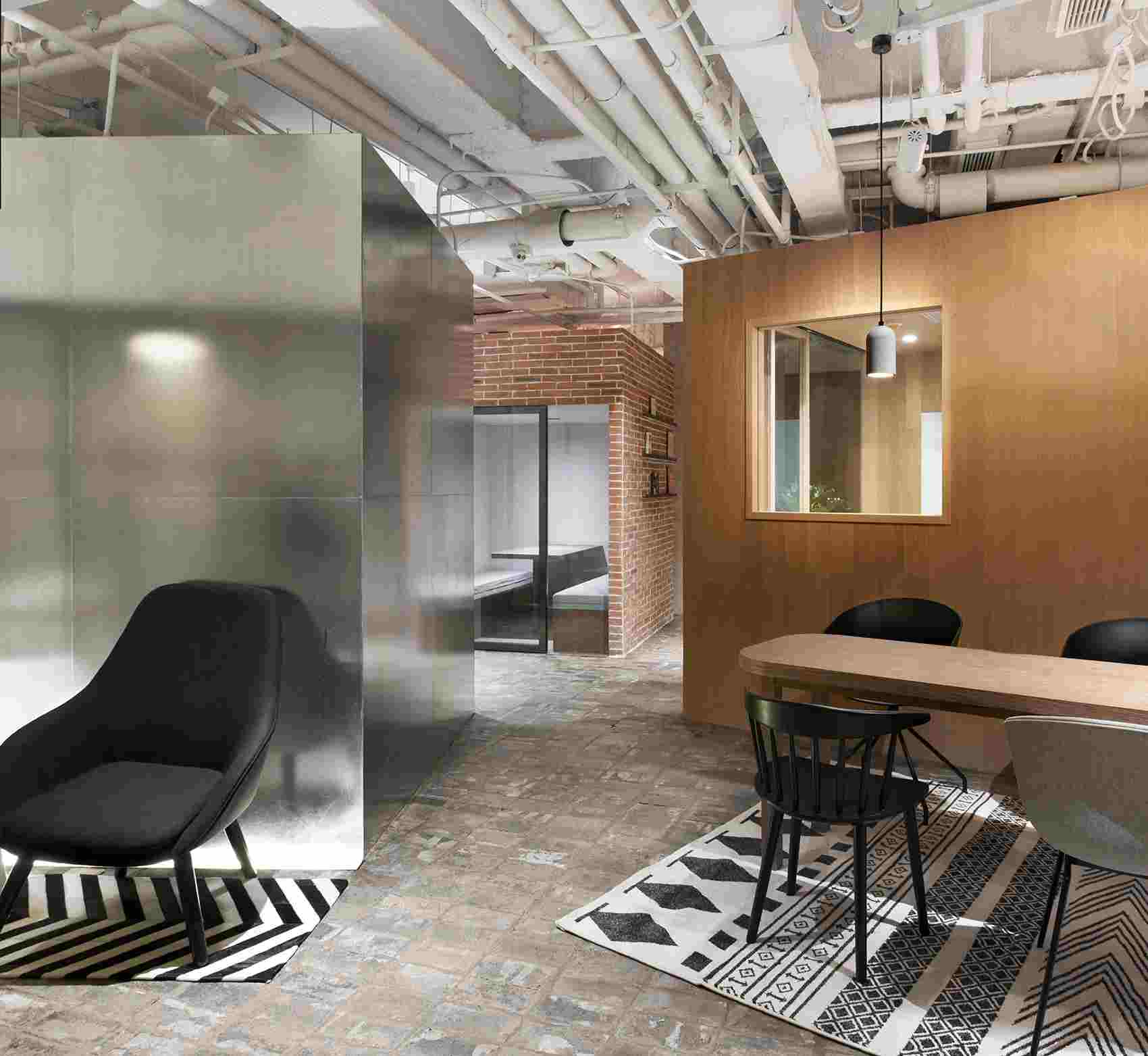 入口處,兩扇2000mm寬的大門設(shè)計(jì),當(dāng)玻璃門打開時(shí),室內(nèi)和走廊形成了相對開放的空間。房間使用了不同的材質(zhì),鍍鋅鋼板,水泥板,木板,紅磚,作為盒子的表面材料。地面則使用了灰磚,地面的破舊感和房子的不同材質(zhì)的對比,形成很大的反差,給人以強(qiáng)烈的視覺沖擊力。?