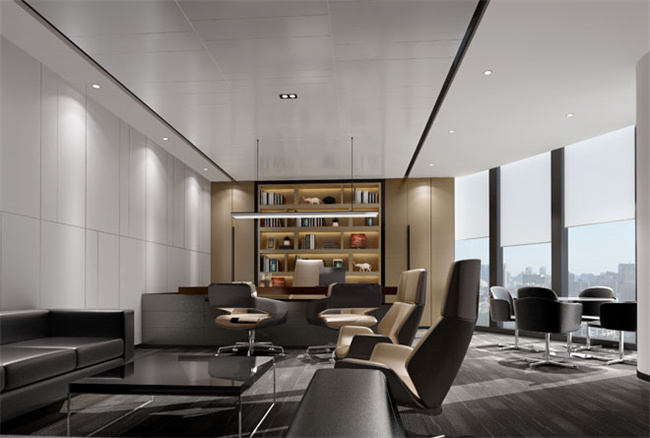 3、集團(tuán)總裁、總經(jīng)理等領(lǐng)導(dǎo)辦公室裝修設(shè)計(jì)直接代表著企業(yè)的形象和實(shí)力。案例中展示的總裁辦公室為新中式風(fēng)格,總裁辦公室既有辦公區(qū)也有接待區(qū),方便了總裁接待客戶(hù)。新中式風(fēng)格既凸顯了總裁的儒雅,也體現(xiàn)了企業(yè)務(wù)實(shí)、內(nèi)斂的特性。