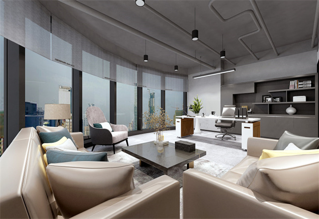 5、董事長(zhǎng)辦公室裝修設(shè)計(jì),整個(gè)空間格調(diào)采用灰色調(diào),形成沉穩(wěn)商務(wù)的搭配,功能分區(qū)劃分明顯,休息待客與辦公相輔相成,頂部框架結(jié)構(gòu),為整個(gè)空間增添了一絲不羈。
