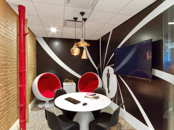 廣告公司辦公室會(huì)客區(qū)設(shè)計(jì):裸露管道被刷成紅色,同時(shí)還設(shè)計(jì)了窩型的坐椅,很有創(chuàng)意感,墻壁上手繪了黑白線條的裝飾畫,空間布置得很有藝術(shù)范兒氣息。公司的VIP會(huì)客室設(shè)計(jì)了玻璃門可以保持大空間的通透感,室內(nèi)的墻壁和天花板都設(shè)計(jì)成紫色調(diào)的,帶來奢華神秘的視覺感,墻壁上掛著裝飾畫,為空間營造出藝術(shù)風(fēng)氣息。