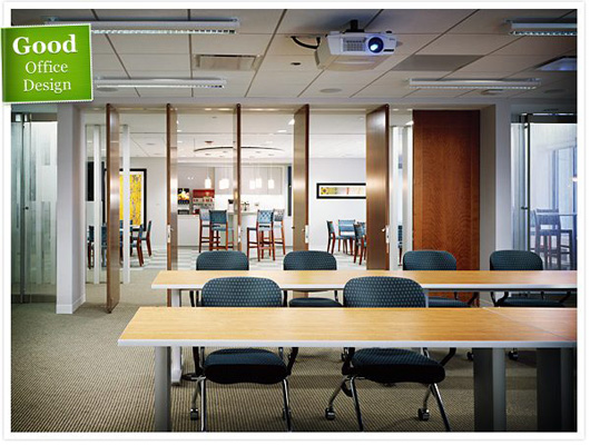 改造后:門后的休息室與培訓(xùn)室想通,窗戶引入的自然光與室內(nèi)燈光有起居室的感覺。空間也可以靈活應(yīng)用,門移至一邊,則變成一大間。
