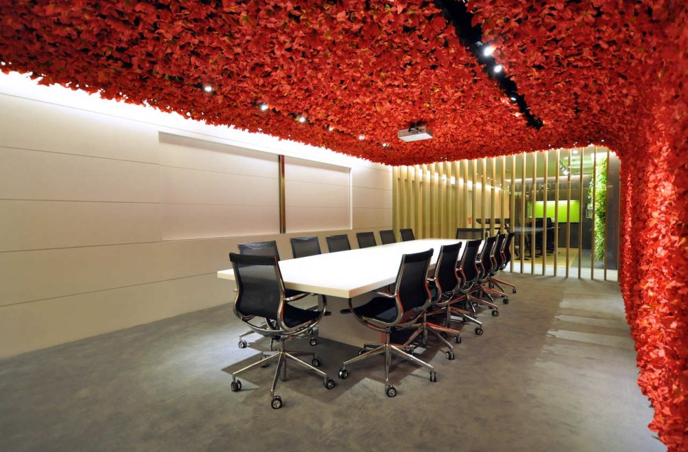令人驚艷的會議室,那滿目鮮艷欲滴的紅色花卉彌漫了大半的會議室空間;小型會議室則以美麗的蝴蝶為設(shè)計(jì)主題,疏密的布局令空間充滿動感;