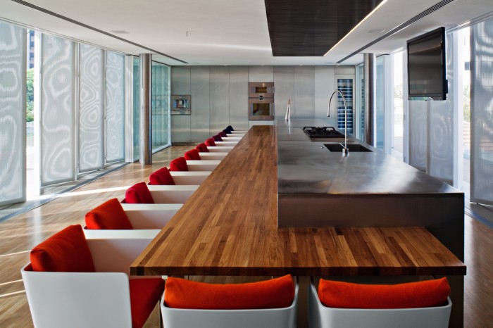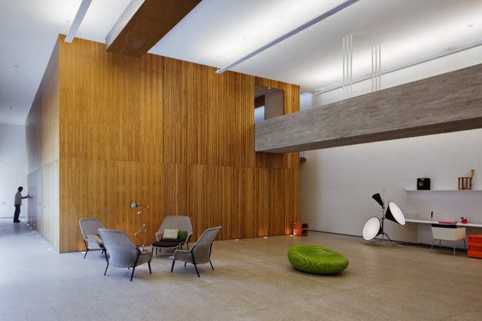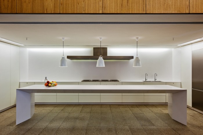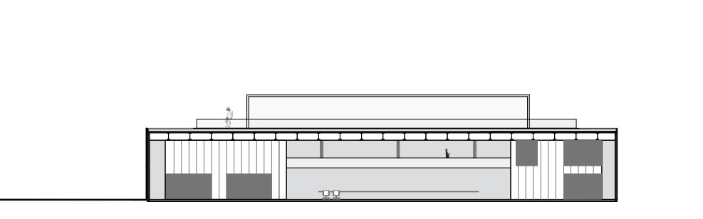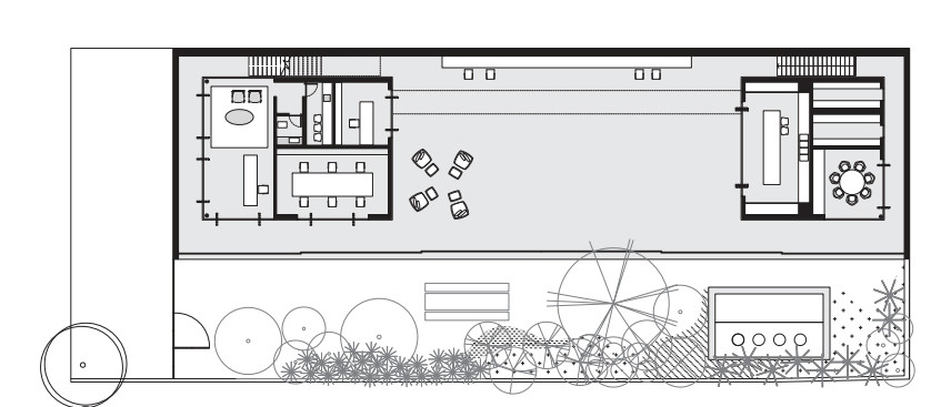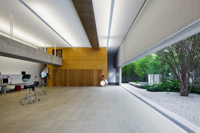 千羽工作室的建筑在長(zhǎng)方形的土地上被分為兩部分,北部是43.5米長(zhǎng)7.2寬的花園,南部為43.5米長(zhǎng)12.2米寬的工作室主體結(jié)構(gòu)。工作室的入口在花園一側(cè),通過(guò)一排滑動(dòng)的金屬門可以進(jìn)入到工作室內(nèi)?;瑒?dòng)門全部打開(kāi)可以直接與外部花園共享,進(jìn)入建筑內(nèi)可以看到一個(gè)混凝土人行道在空中將兩個(gè)木制盒型的空間鏈接,而且具有很強(qiáng)的視覺(jué)沖擊力。