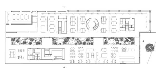 綠植陽(yáng)光房的一側(cè)為提供休息座椅的雙層空間,中心區(qū)域的白色體塊包含了一個(gè)衛(wèi)生間與大理石臺(tái)面的咖啡間。陽(yáng)光房的另一側(cè)為兩層辦公空間,通過(guò)旋轉(zhuǎn)樓梯連接。同時(shí),建筑立面上增加了一排大窗戶,以擴(kuò)大從街道到辦公室內(nèi)的視野。