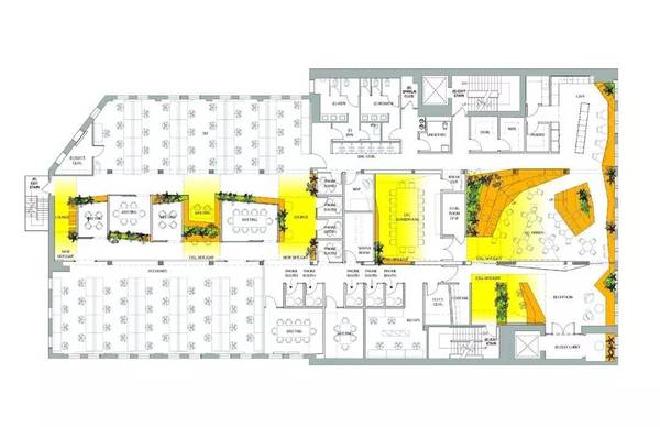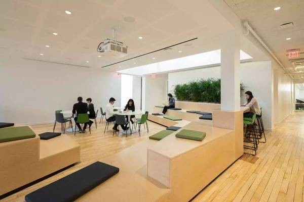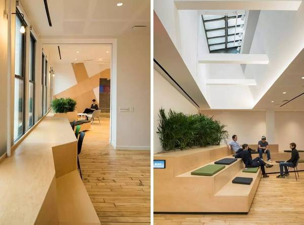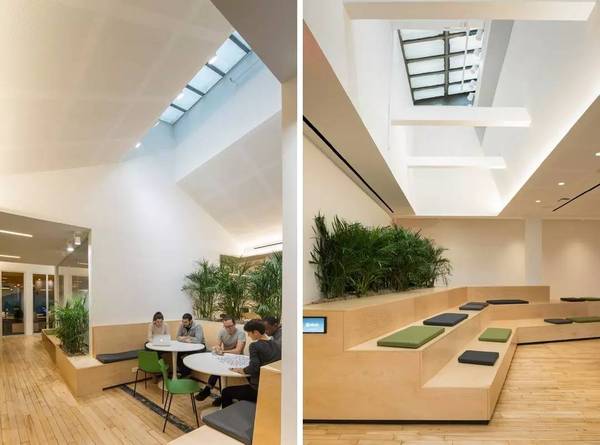 Sn?hetta對Slack新紐約空間設(shè)計(jì)的靈感來源于**特色的城市小院。從Paley Park的室內(nèi)景觀中吸取靈感,竹植物提供自然的隱私屏幕,并為綠化帶來空間。現(xiàn)有四個天窗與放大,八字天花板大大增加了室內(nèi)以及內(nèi)部小庭院的自然光線。