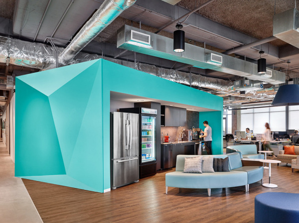 時尚辦公網(wǎng)很喜歡咖啡吧和休息室的設計,巧妙的運用不規(guī)則幾何造型,再涂刷以Bazaarvoice的品牌色系如:草綠、海藍、天藍和青色,讓整個空間充滿了清新活力。室內(nèi)還特別設計了一處名為 “Help Desk” 的網(wǎng)絡技術服務中心,實木的墻面、實木的格柵吊頂,配以黑色熱軋鋼制作的吧臺和溫暖的光照。