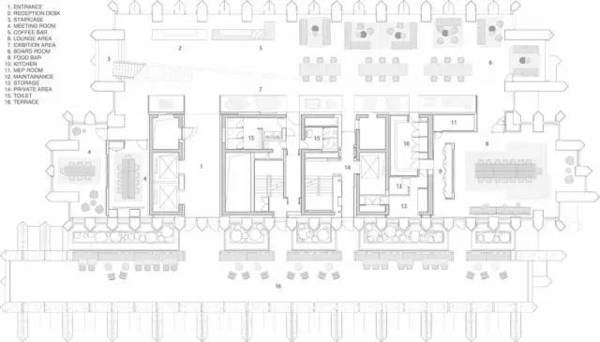 室內(nèi)和室外同時使用了簡化的米黃色的石材,作為對于外灘老上海建筑的一種追溯,還使用仿佛能把人帶入未來的簡潔而堅硬的白色墻面。此外還有許多的小細節(jié):電梯廳附近45度的傾角;奶油色的石材使得空間看上去更加開闊;明亮的光照,在上海的古老和現(xiàn)代之間尋找到平衡。