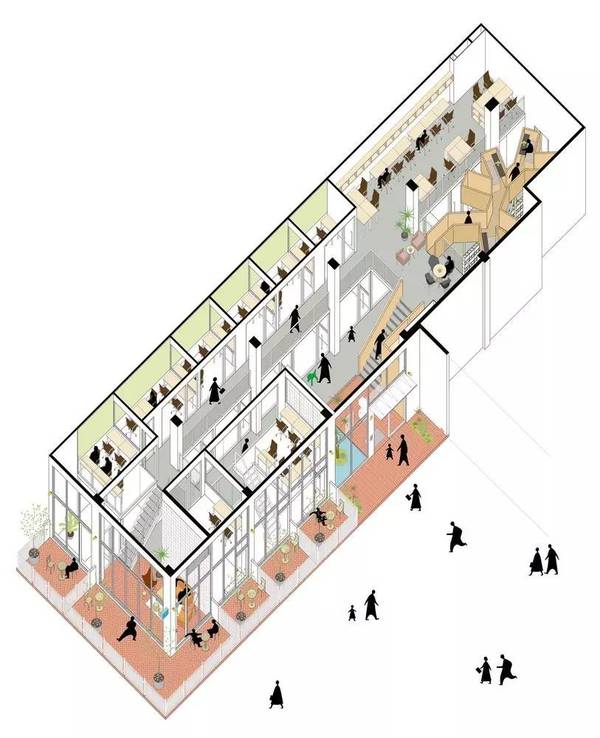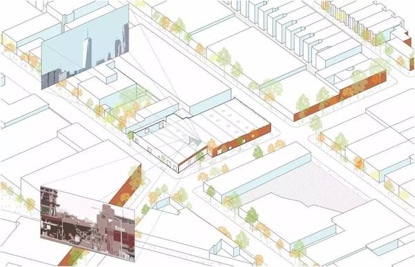 這樣的設(shè)計手法,給予室內(nèi)空間相互關(guān)聯(lián)。同時,設(shè)計者還對建筑入口進(jìn)行了從視覺化的處理,移除面向西南角的三角形的區(qū)域,改為透明的立面,將被涂鴉的磚墻重新組裝,以制造出不同的涂鴉樣式,以此表現(xiàn)建筑以及社區(qū)間層層疊加以及穿插的歷史。