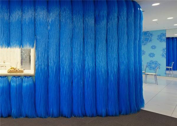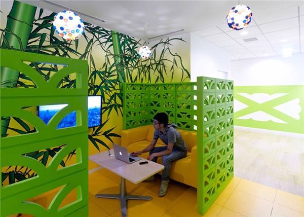 眾所周知,Google的logo由藍、紅、黃、綠四種顏色組成。這么多鮮艷的顏色混在一起,在進行辦公室裝修時難免會面臨必須避免雜亂感的難題。但Google是不會放棄展示自我個性的,尤其是在進門處這么顯眼的地方。而聰明的設計師選擇了通過軟裝修來協調:黃色的接待臺,紅色的壁紙,綠色的“吉祥物”,以及地上藍、紅、黃、綠四色地毯,這些無不與墻上的logo相呼應展現了錯落有致的層次感。壁紙上的和風花紋,黃、藍、綠三色營造的仿若沙灘、海水和椰子樹的環(huán)境,再加上仿若沙灘椅的座椅,都展示了日本作為一個島國的特色。