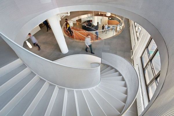 連接6、7樓的是用胡桃木做成的錢幣狀圓形梯,有著樓梯式座椅,可在蜘蛛狀結構的天花下進行議或者漫談,這樣的建筑設計可轉移一根圓柱的承載力。