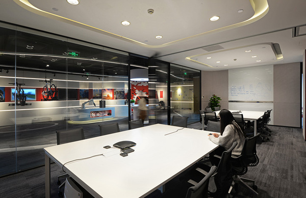 上海領(lǐng)企創(chuàng)裝飾公司分享的這套網(wǎng)絡(luò)科技辦公室裝修設(shè)計(jì)圖中,辦公室前臺(tái)及展廳的設(shè)計(jì)采用了弧形墻體,墻體上的弧形燈帶、天花上的吊燈以及不同顏色地毯拼接而產(chǎn)生曲線元素貫穿整個(gè)展廳空間,帶來(lái)極強(qiáng)的視覺延伸感。配合了VR等互動(dòng)體驗(yàn)裝置,以及實(shí)體產(chǎn)品,為訪客帶來(lái)富有科技感的體驗(yàn)感受。提高空間的功能性和使用效率,大會(huì)議室可以在需要的時(shí)候由移動(dòng)隔斷分割為兩個(gè)獨(dú)立的會(huì)議室使用。下面領(lǐng)企設(shè)計(jì)創(chuàng)裝飾公司小編帶大家看一下1200科技公司辦公室裝修案例!