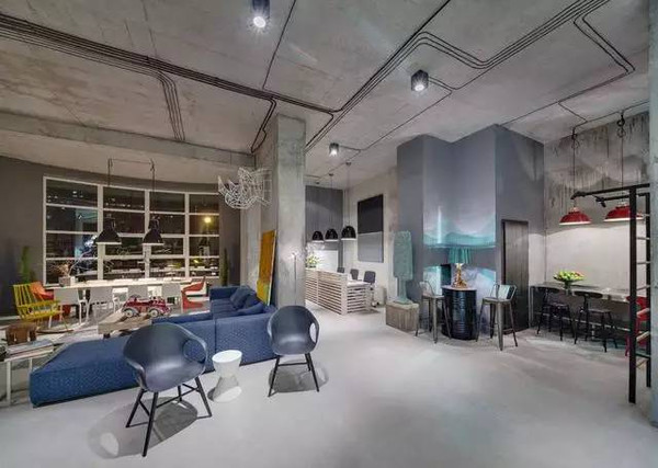 整個空間的墻體和屋頂沒有做處理,保留了原始的味道,大膽的顏色和有創(chuàng)意的家具,是它的亮點,也是設(shè)計的重點,高純度的黃色和藍色的碰撞,為空間增加了時尚感。