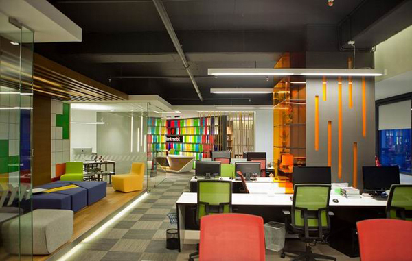 辦公區(qū)域的設(shè)計更有特點,天花設(shè)計成網(wǎng)狀造型,線條感特出,天花吊頂由兩種色彩不規(guī)則的幾何體組成,設(shè)計師把它們合理排列,表現(xiàn)出滿滿的藝術(shù)氣息。設(shè)計師辦公桌顏色搭配也十分新穎,風(fēng)格與主色調(diào)統(tǒng)一,也選用彩色搭配,顛覆了以往單調(diào)的純色系列,這個創(chuàng)新十分大膽,創(chuàng)意無限。整個空間的設(shè)計用天花的蘋果綠和多彩的墻身色調(diào),使整個辦公區(qū)表現(xiàn)出輕松、愉快的感覺。