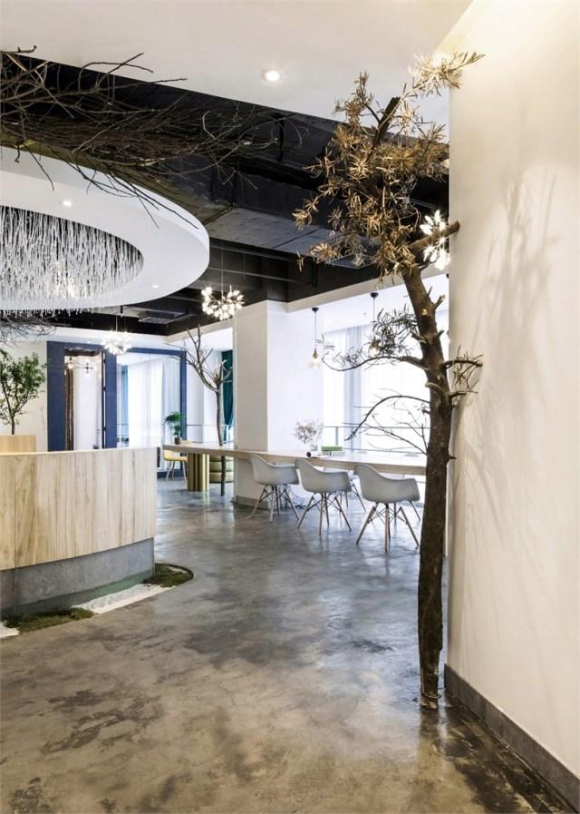 在材料的運用上選用的都是一些環(huán)保低碳的天然材料,如樹枝、石竹、枯木、天然原木板,地面則是采用了水泥自流平的方式。