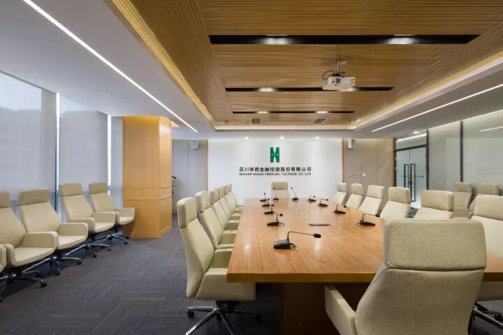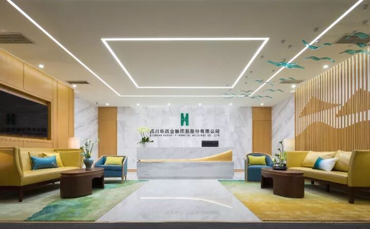 在無色調中融入海闊天空的藍綠色,與象征金融財富的黃色搭配,在現(xiàn)代簡潔空間中加入適度時尚元素,為華西集團旗下公司打造出耳目一新的品牌形象。