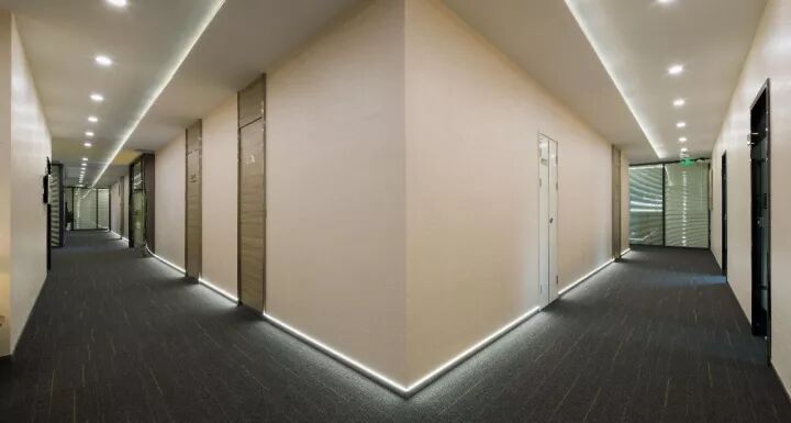 過道的踢腳線線性燈,型材7mm寬,完全嵌入物業(yè)的不銹鋼踢腳線凹槽中,干凈利落有意境,形成過道的一大亮色。