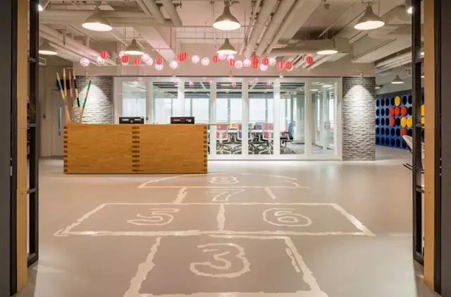 24,000平方英尺的辦公室共分為兩層。作為一家創(chuàng)意機(jī)構(gòu)其自身的辦公室定要符合其品牌形象,進(jìn)入電梯廳,一道游樂(lè)場(chǎng)式樣的大門(mén)緩緩打開(kāi),地面上繪制著小時(shí)候大家熟悉的跳房子游戲圖形,親切而有趣的視覺(jué)圖形將視線引入接待大廳,并穿透層層玻璃會(huì)議室,看向遙遠(yuǎn)的海港。