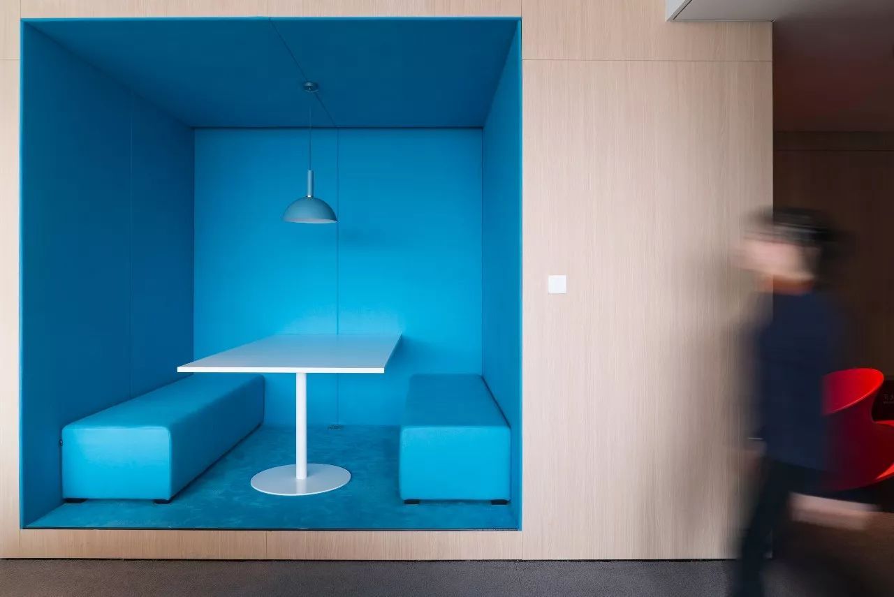 每個單獨(dú)的盒子,被賦予簡單純粹的色彩和材質(zhì),比如包裹墻面和天花的彩色吸音毛氈,有效降低與其他區(qū)域的相互干擾,實(shí)現(xiàn)**的聲學(xué)效果。人在里面活動時,空間和人的關(guān)系,以及人與人的關(guān)系變得更緊密而有趣,同時獲得一種沉浸式的空間體驗(yàn),使討論或工作變的更放松和專注。