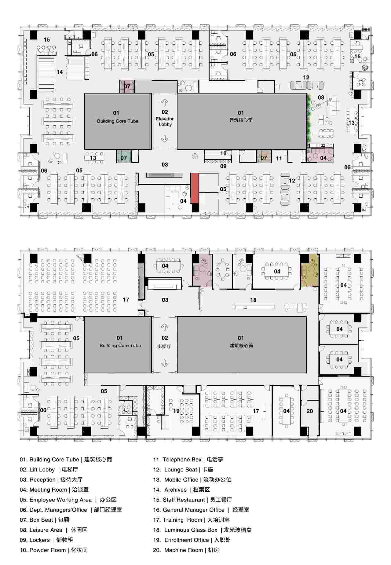 ![]() 中原地產(chǎn)在深圳經(jīng)過二十年的深耕,目前區(qū)域員工達(dá)到11000多人,是深圳規(guī)模**的專業(yè)地產(chǎn)代理公司。Peng & Partners (P&P)為其位于深圳后海的新總部辦公空間進(jìn)行了大刀闊斧、革命性的設(shè)計(jì)。 ?作為一家港資企業(yè),其過去20年的發(fā)展中,一直秉承著拼搏進(jìn)取、專業(yè)嚴(yán)謹(jǐn)?shù)南愀劬?,這也反映在老的辦公空間的形象上。在當(dāng)下的重要時(shí)間節(jié)點(diǎn),企業(yè)希望融合深圳大膽創(chuàng)新的精神,活力、開放與協(xié)作。 ![]() 整個(gè)項(xiàng)目包含建筑的四層樓,三層為辦公樓層,另一層為會(huì)務(wù)中心層。 大廳天花頂部的開孔與立面的開孔相呼應(yīng),呈現(xiàn)豐富而有趣的空間構(gòu)成和層次的延伸感。 ![]() ![]() “盒子”的概念貫穿整個(gè)設(shè)計(jì),通過相減、擠壓、鑲嵌、堆疊等, 對(duì)基礎(chǔ)的方塊進(jìn)行加工變形,產(chǎn)生不同的正相和負(fù)相空間,以不同組合方式,串聯(lián)起來。盒子的不同開口方向和尺度,呈現(xiàn)出有趣的對(duì)比關(guān)系和節(jié)奏:私密與開放、狹窄與舒張、幽暗與明亮… ![]() ![]() ![]() ![]() 每個(gè)單獨(dú)的盒子,被賦予簡單純粹的色彩和材質(zhì),比如包裹墻面和天花的彩色吸音毛氈,有效降低與其他區(qū)域的相互干擾,實(shí)現(xiàn)**的聲學(xué)效果。人在里面活動(dòng)時(shí),空間和人的關(guān)系,以及人與人的關(guān)系變得更緊密而有趣,同時(shí)獲得一種沉浸式的空間體驗(yàn),使討論或工作變的更放松和專注。 ![]() ![]() ![]() 為了弱化傳統(tǒng)辦公室的緊張氛圍,公共休閑區(qū)配置了特別大的面積,包括大面積的垂直綠化墻、廚房及水吧。成為員工聚會(huì)、休息,或工作交流、頭腦風(fēng)暴的聚集地。模塊化的沙發(fā),能實(shí)現(xiàn)多變的組合方式,以及滿足員工360度全方位的無障礙溝通。 ![]() ![]() 9㎡部門經(jīng)理辦公室,在功能布置上做了很大的改變和創(chuàng)新,所有的功能構(gòu)件沿著空間四周墻面布置,儲(chǔ)物、辦公、休閑、閱讀及交流等,非常巧妙的銜接,使得小面積卻擁有寬敞舒適之感。 ![]() ![]() ![]() 會(huì)務(wù)中心層的發(fā)光玻璃墻,滿足了整個(gè)空間的照明,同時(shí)又成為空間的視覺核心,營造出純粹、安靜、脫俗的藝術(shù)辦公空間氛圍。 ![]() ![]() ![]() ![]() ![]() ![]() ![]() ![]() 整體空間的人流動(dòng)線簡潔清晰,工作交流快速**。 ![]() ![]() ![]() ![]() ![]() 空間的平面指示系統(tǒng)設(shè)計(jì),結(jié)合簡潔的造型體塊、線條和光線,呈現(xiàn)出耳目一新、時(shí)尚優(yōu)雅的氣質(zhì)。 ![]() ![]() 整個(gè)設(shè)計(jì)過程中,都在嘗試對(duì)傳統(tǒng)的辦公方式帶來改變,創(chuàng)造一個(gè)嶄新愉悅的工作體驗(yàn)。 ![]() ![]() ![]() ![]() 平面規(guī)劃: 依據(jù)場(chǎng)地的條件,以及體現(xiàn)企業(yè)文化和對(duì)員工的關(guān)懷,優(yōu)先保證各個(gè)部門擁有*有利的采光、通風(fēng)和*佳的景觀視野,員工辦公區(qū)域設(shè)置在靠窗的位置,部門參照柱位劃分。其余的功能區(qū)塊,如儲(chǔ)物、洽談區(qū)、影印室以及電話亭等,沿建筑核心筒集中排列。 ![]() |
