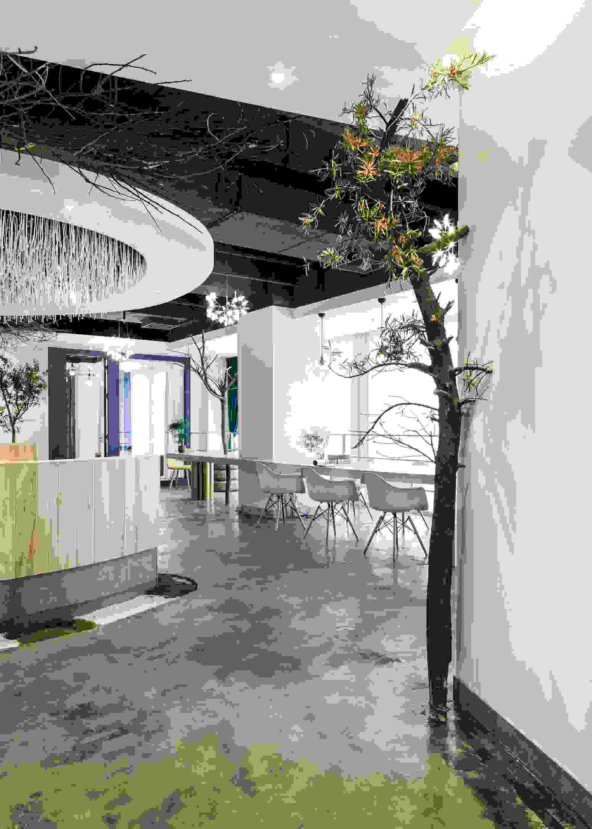 東方的美學(xué)向來是含蓄溫婉的,LOGO墻處的玻璃透景配合自然的竹石,隨著太陽的變化,光影也在不斷的變化,猶如人生。在材料的運(yùn)用上選用的都是一些環(huán)保低碳的天然材料,如樹枝、石竹、枯木、天然原木板,地面則是采用了水泥自流平的方式。