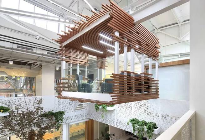 案例四:辦公樓前廳的整體設(shè)計(jì)同樣采用極簡(jiǎn)潔的設(shè)計(jì)風(fēng)格,墻面肌理粗獷自然,前臺(tái)的造型及材質(zhì)簡(jiǎn)單又不失穩(wěn)重的質(zhì)感,通高白色墻面正對(duì)著入口并投影播放畫面,時(shí)常宣傳公司的企業(yè)文化,在靜態(tài)中增加了整體裝飾的動(dòng)感。中庭至上我們能看到一個(gè)倒掛的“樹屋”空間,由鋼結(jié)構(gòu)搭建而成。實(shí)木條拼接包裹外圍,猶如深林木屋,幫助人們減壓。透明玻璃墻面的圍合,使整個(gè)空間更加通透開闊,與整個(gè)辦公空間密切聯(lián)系。充分利用空間的同時(shí),大大增加中庭結(jié)構(gòu)的層次感,造型上也更加豐富。辦公室裝修設(shè)計(jì)以白色簡(jiǎn)潔為基調(diào),島臺(tái)圍合式的辦公桌設(shè)計(jì)整潔而連續(xù)。而開放式的休閑討論區(qū),便于員工們交流與共享。員工休閑餐飲區(qū)域位于二樓,這里同時(shí)設(shè)計(jì)了連接室外的休憩平臺(tái),讓員工在工作之余可以感受室外自然。樹屋的頂部還有一個(gè)小型喝茶享受空間,發(fā)揮空間優(yōu)勢(shì),更好地利用疊層關(guān)系。